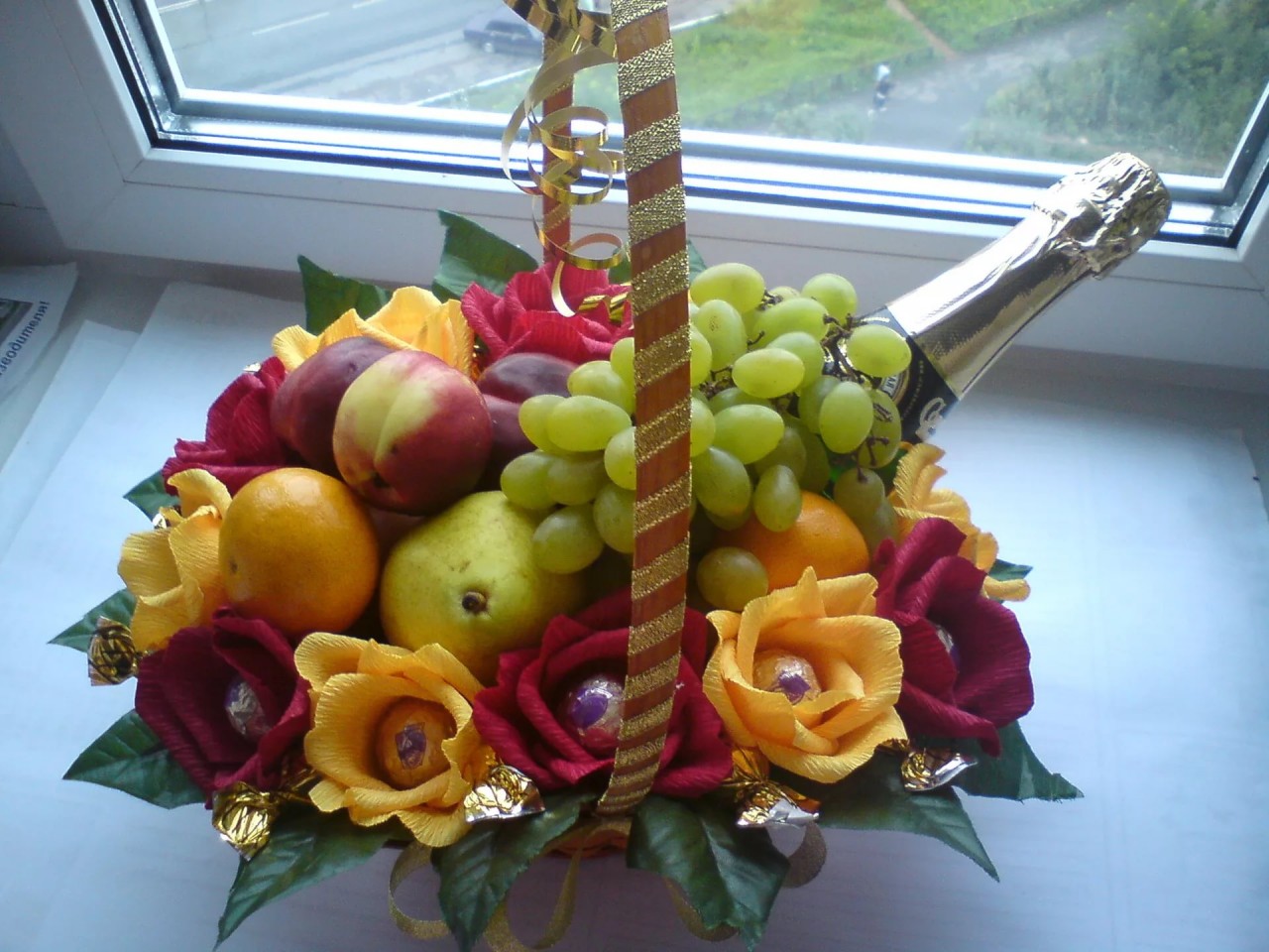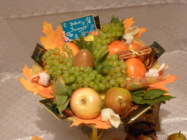 Яблоки разного цвета, можно жёлтого и красного, наколите на шпажки. То же самое проделайте с маленькими сливами контрастного цвета, можно добавить сюда ягоды винограда. В промежутках между ними расположите осенние цветы и шоколадные конфеты, желательно с различными наполнителями. Обернуть такой букет можно гофрированной бумагой яркого цвета и перевязать оригинальной лентой. Композиция – практически совершенство!