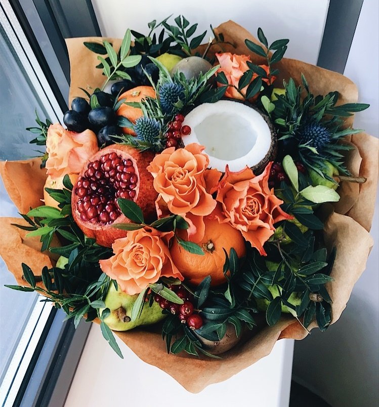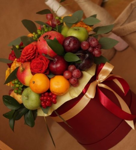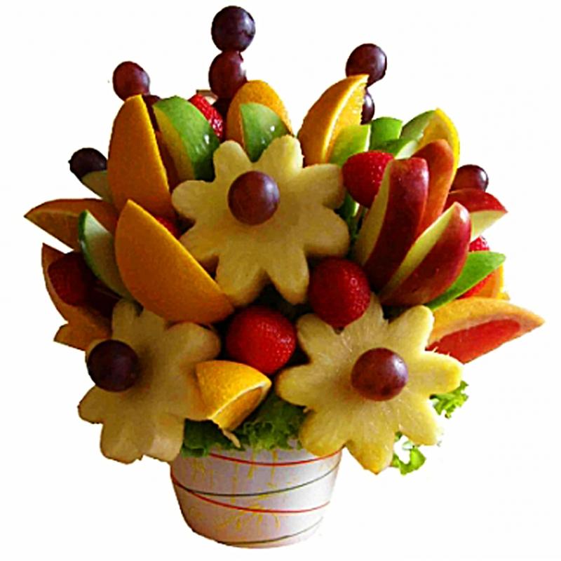 Неповторимость живой связки из красиво нарезанных или целых плодов будет отмечена и одаряемым, и гостями праздника. Иногда вместе с фруктами в такой букет добавляют живые цветы или листья растений, зелень или овощи, иногда шоколадные сладости.