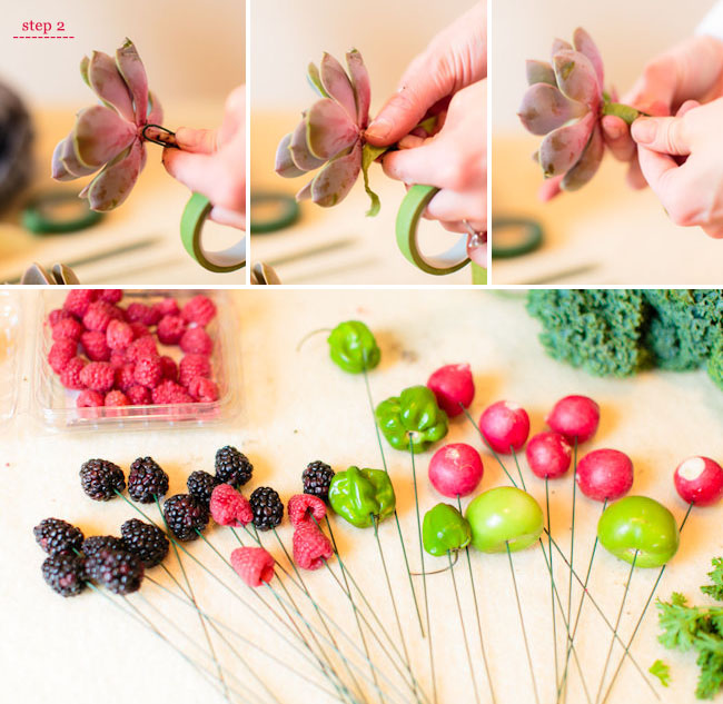 - Шпажки, на которых будут держаться плоды, можно расположить на разном уровне высоты, что придаст вашему букету дополнительный объём.