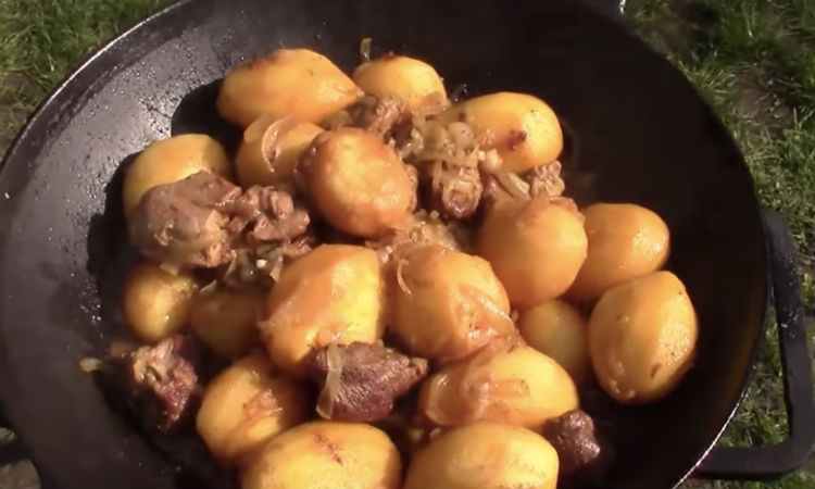 Очищенный и промытый лук нарезается полукольцами. Картофель резать не надо, он добавляется целиком. А вот мясо идет на сковороду порезанным небольшими кусочками, так получается вкуснее.