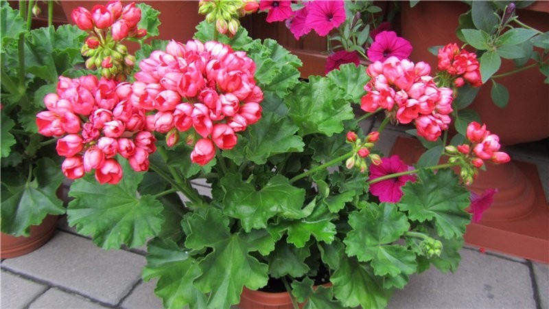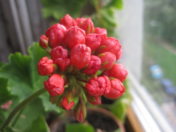 «Неужели это герань так цветет?», – спросила я. На что бабулька бодро ответила: «Пеларгония – это вам не герань! А это – тюльпановидная пеларгония сорта RED PANDORA. Очень интересный и неприхотливый сорт, между прочим». Растение было ровненьким и гладеньким. Но подкупило меня наличие еще нескольких цветоносов, которые вот-вот должны были зацвести.