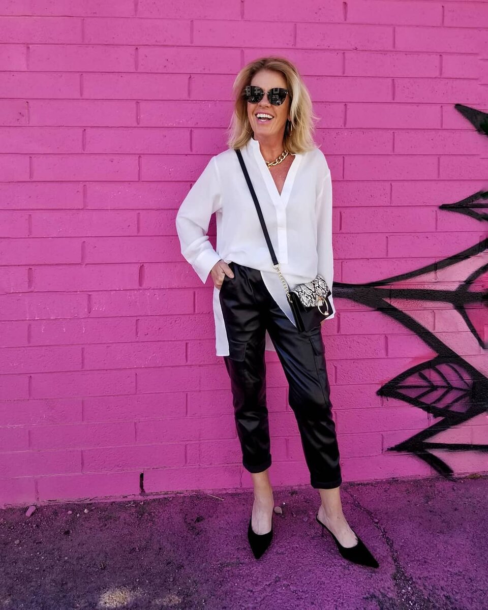 Шикарные кожаные брюки дамам 50+ можно сочетать с асимметричной белой блузкой. Остроносые мюли на небольшом каблуке + массивная цепочка — гармоничное и удачное дополнение к стильному и минималистическому луку.