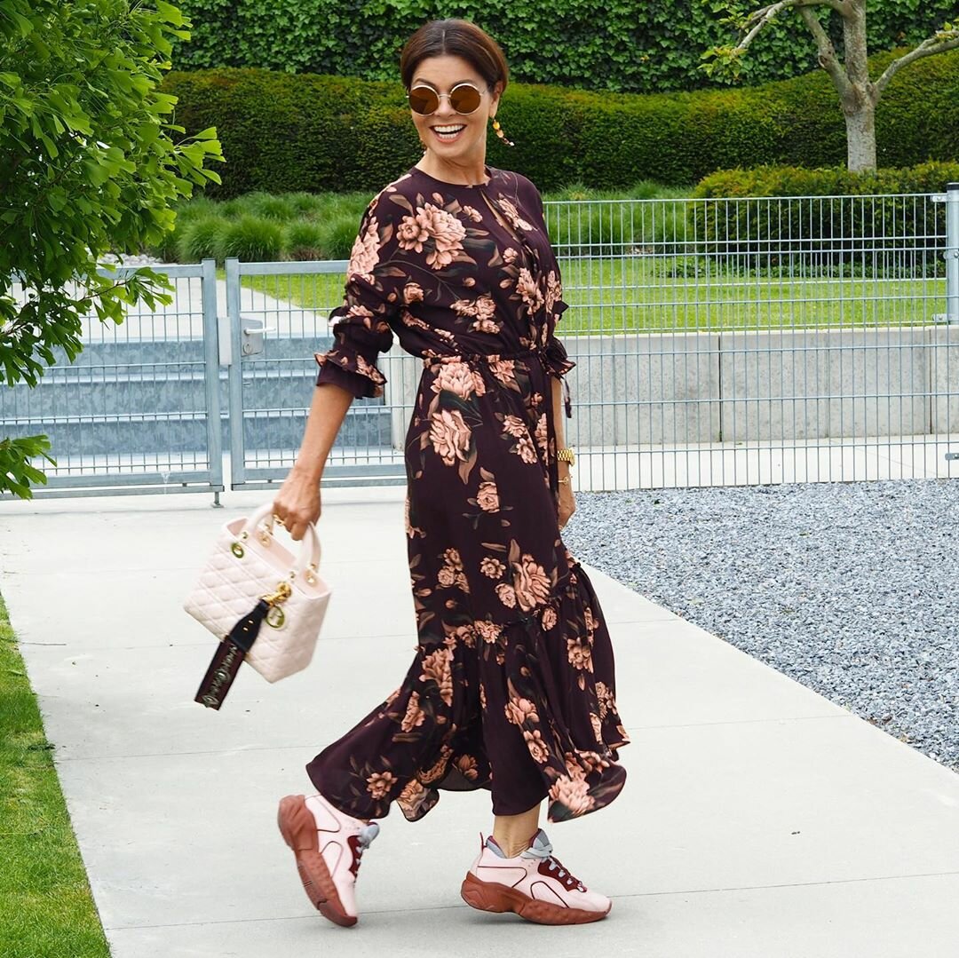 Платье макси в стиле Бохо украшенное цветочным принтом, воланами и воздушными рукавами — тренд лета 2020 года, который должна примерить на себя женщина любого возрастного диапазона. Женственное и элегантное платье стилисты советуют сочетать с массивными кроссовками и небольшой брендовой сумкой.
