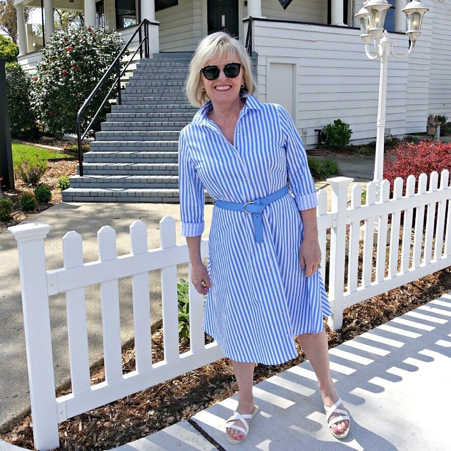 Полосатое платье-рубашка + сандалии на плоском ходу — лаконичный, легкий и комфортный образ для зрелой женщины.