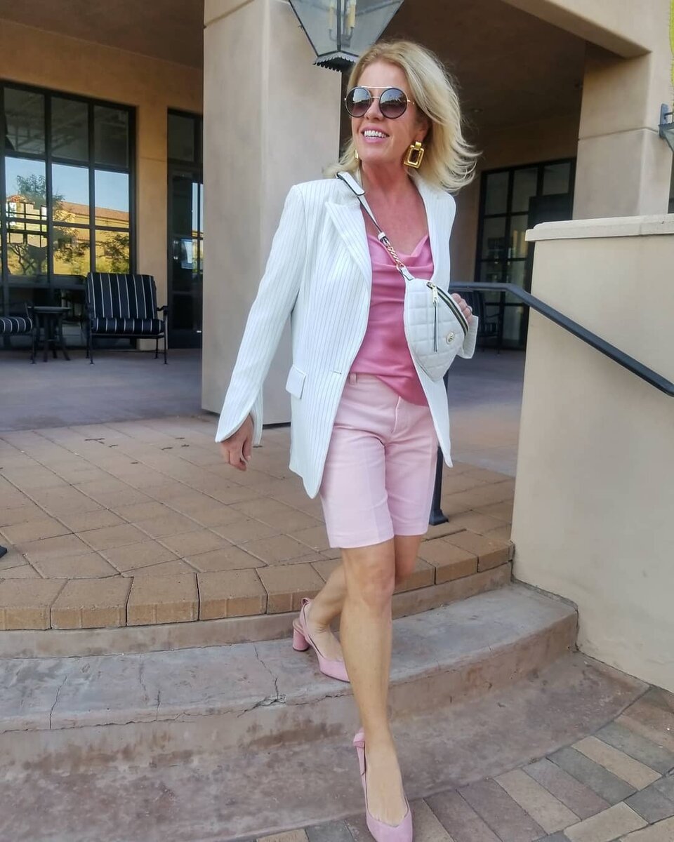 Шорты нежно-розового цвета + шифоновая блузка + полосатый жакет + мюли в тон наряда — нежный летний образ, который следует выбирать всем зрелым дамам в новом сезоне.