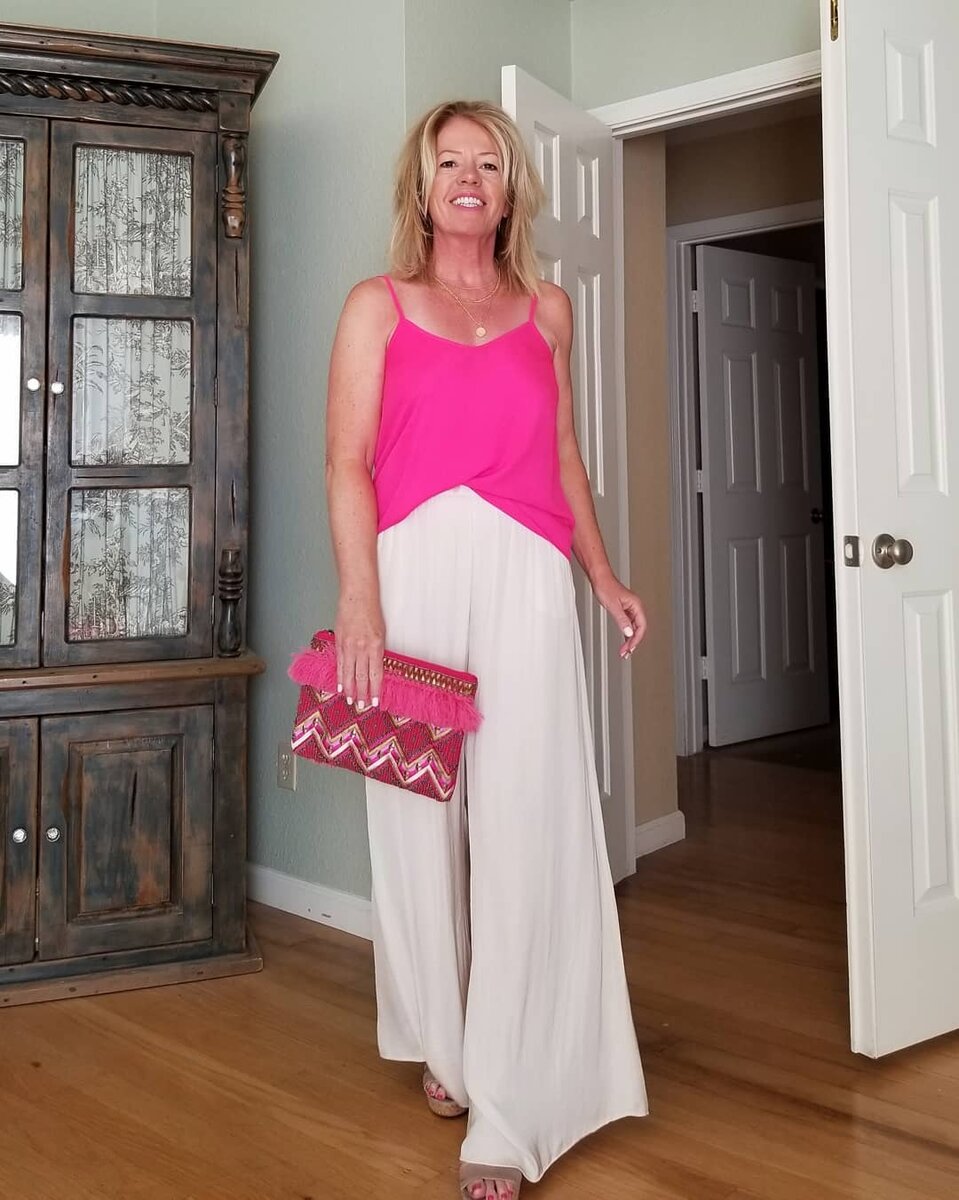 Белые брюки палаццо из натуральной ткани можно комбинировать с яркой майкой — данная композиция базовых вещей добавит необходимого колорита зрелой даме в новом сезоне.