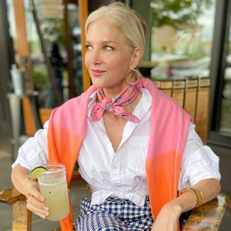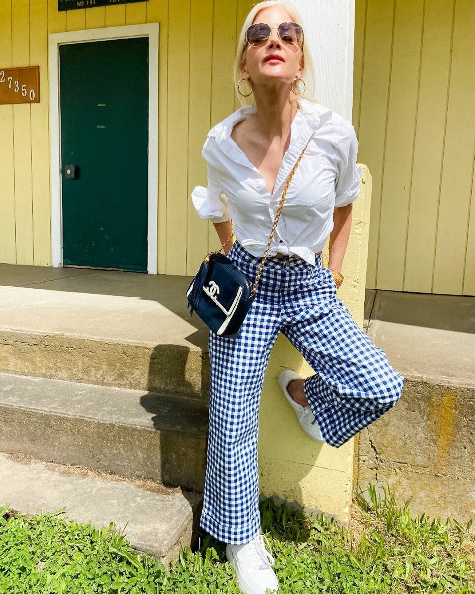 Дама возраста 50+ может составить для себя летний образ с клетчатыми оверсайз брюками и белой рубашкой, а яркости и контрастности этому образу добавит пестрый свитер, накинутый на плечи и шелковый платок.