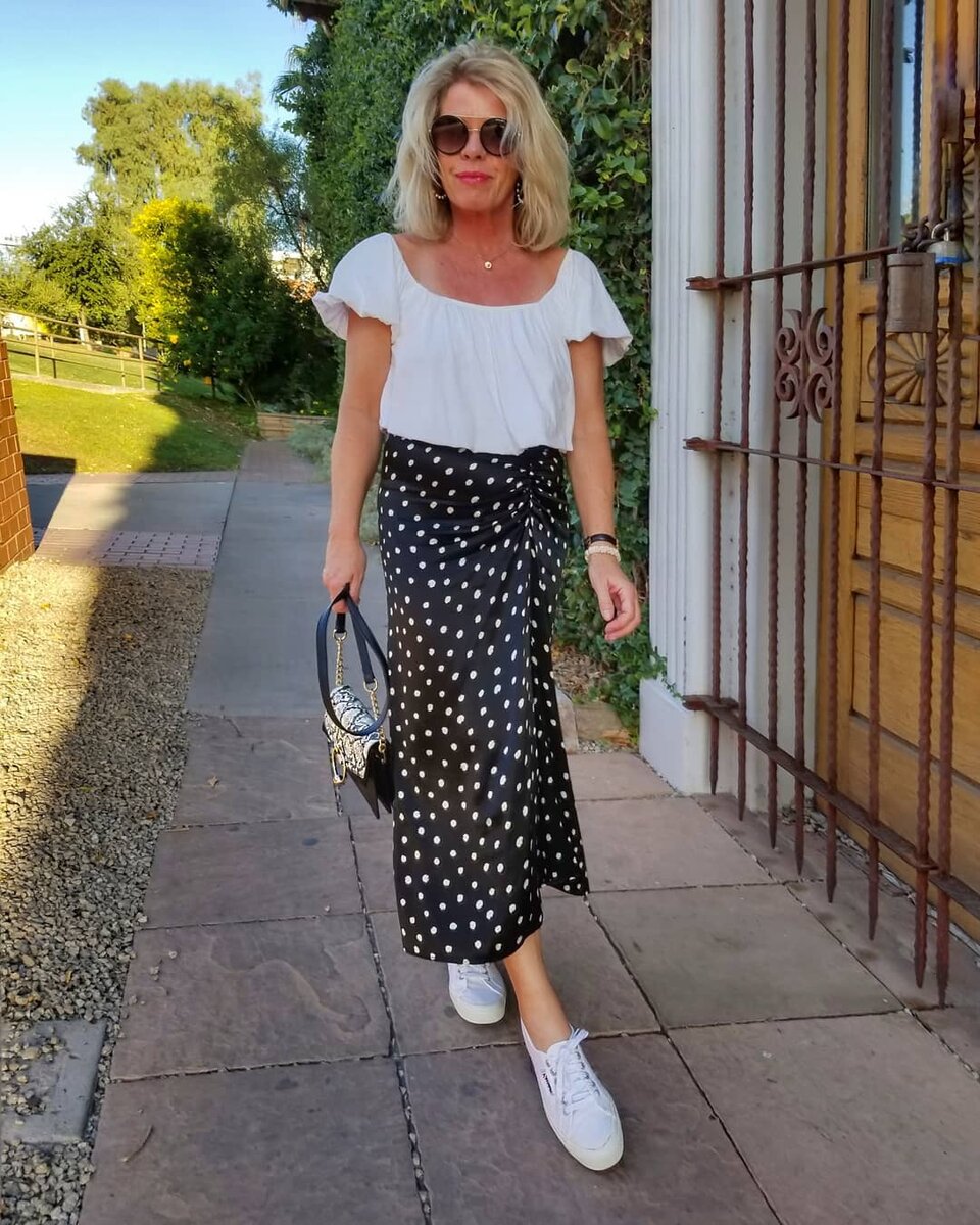 Плиссированные, на запах, а также шифоновые юбки прямого кроя — идеальная вещь, которая должна присутствовать в гардеробе у всех современных зрелых модниц. Стилисты советуют комбинировать трендовые шифоновые юбки с рубашками, блузками, а также пестрыми жакетами. Белые кроссовки, мюли, а также босоножки с тонкими лямками — идеальная обувь для летних аутфитов.