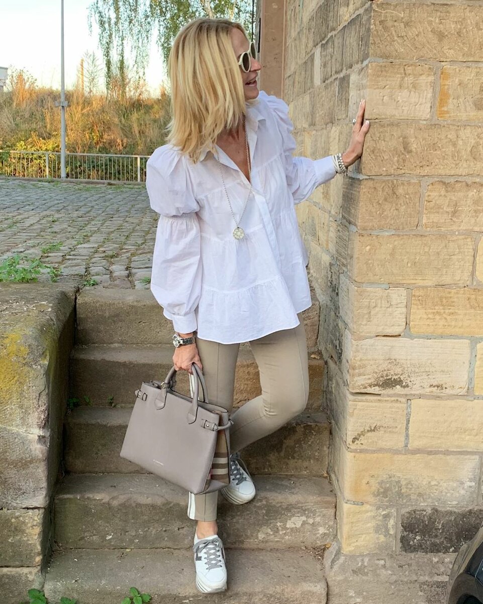 Блузка с пышными рукавами белого цвета + базовые брюки прямого кроя + громоздкие кроссовки светлого оттенка — гармоничный светлый образ, который украсит собой и сделает внешность любой современной дамы моложе и элегантней.